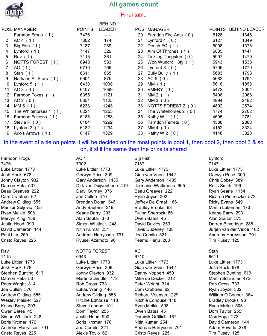 1st £25 2nd £8 & Last place get a free lucky dip on the next game