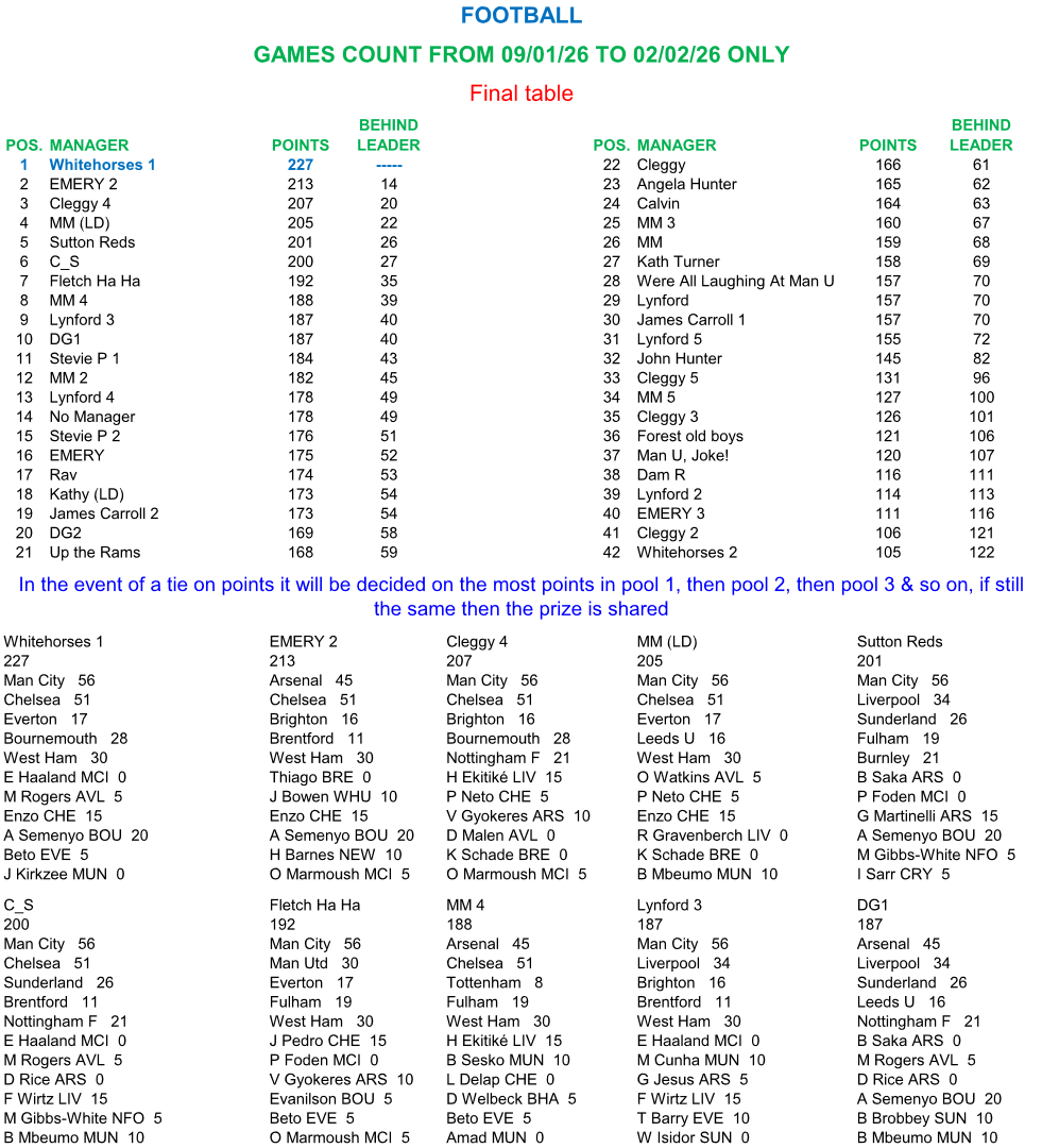 1st £23, 2nd £9, 3rd £5 & Last place get a free lucky dip on the next game