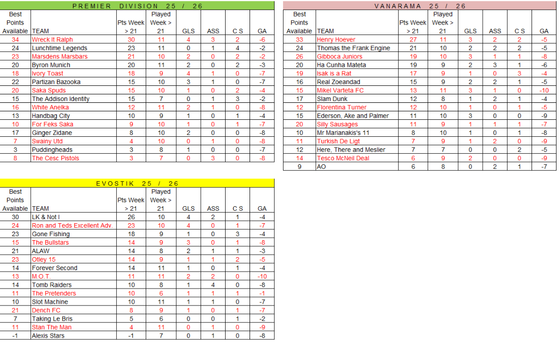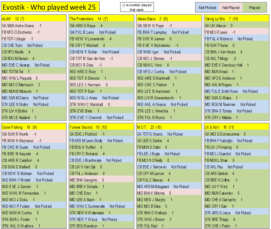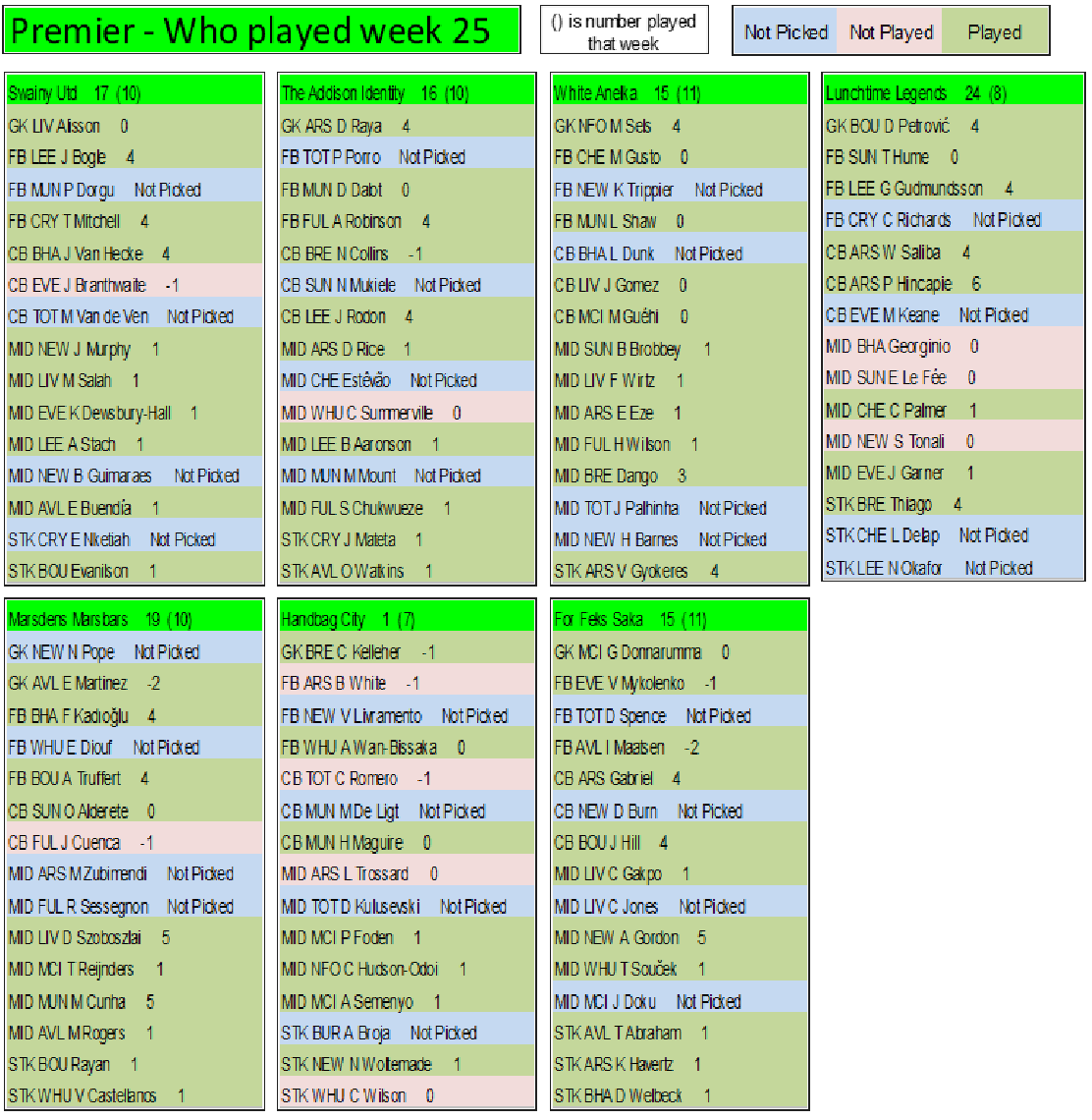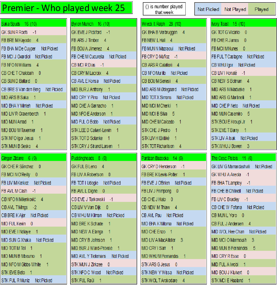 Final week on the final week (If scores are even then it goes on goals, assists, clean sheets, played, If still even then the earliest goal, earliest assist. If still even the player with the most points in the league, if even then the highest score the week before & so on till we have a winner)
