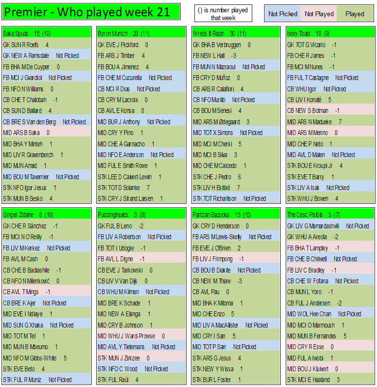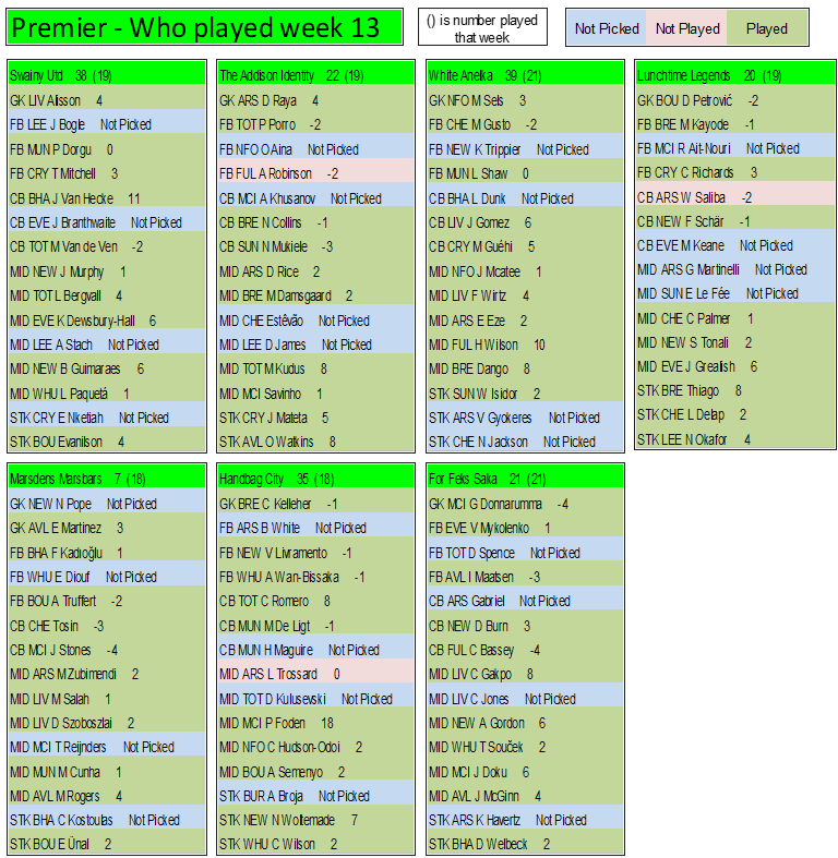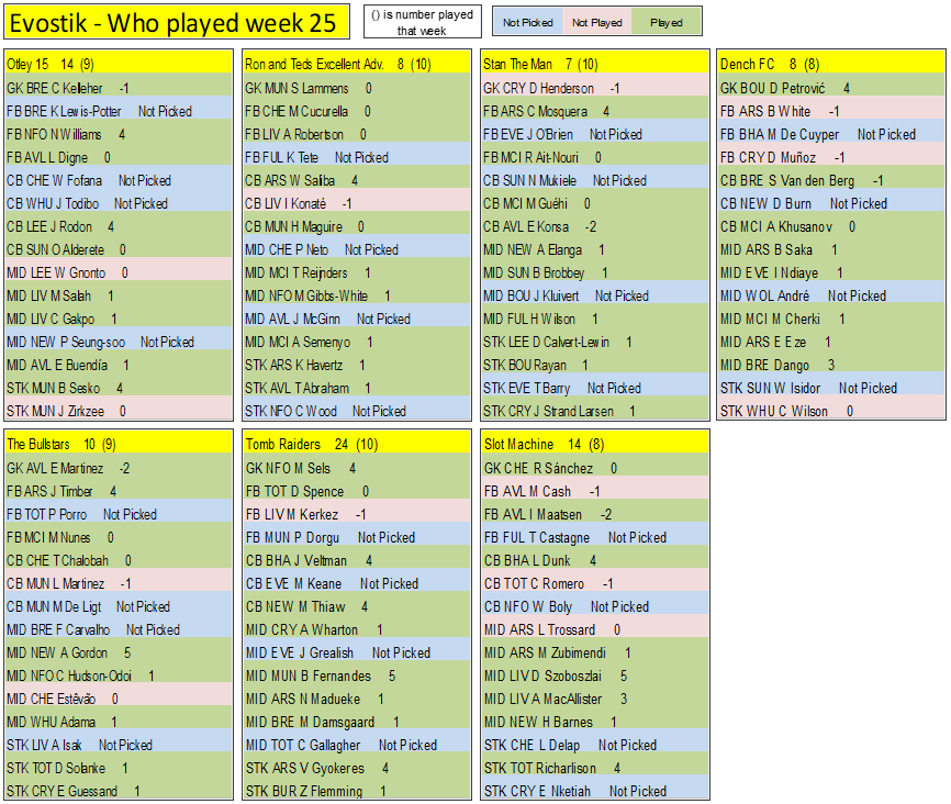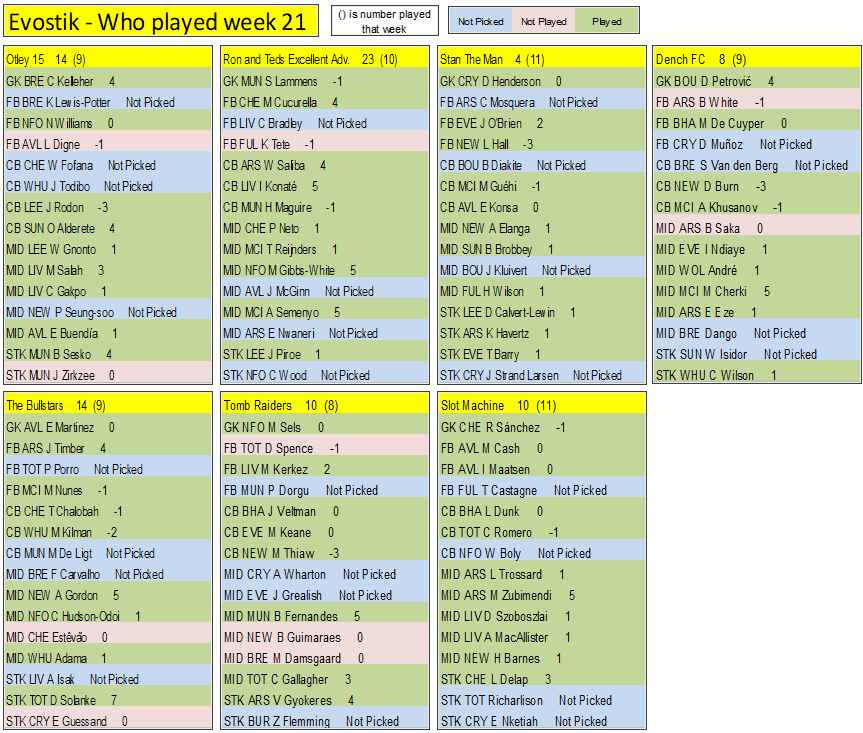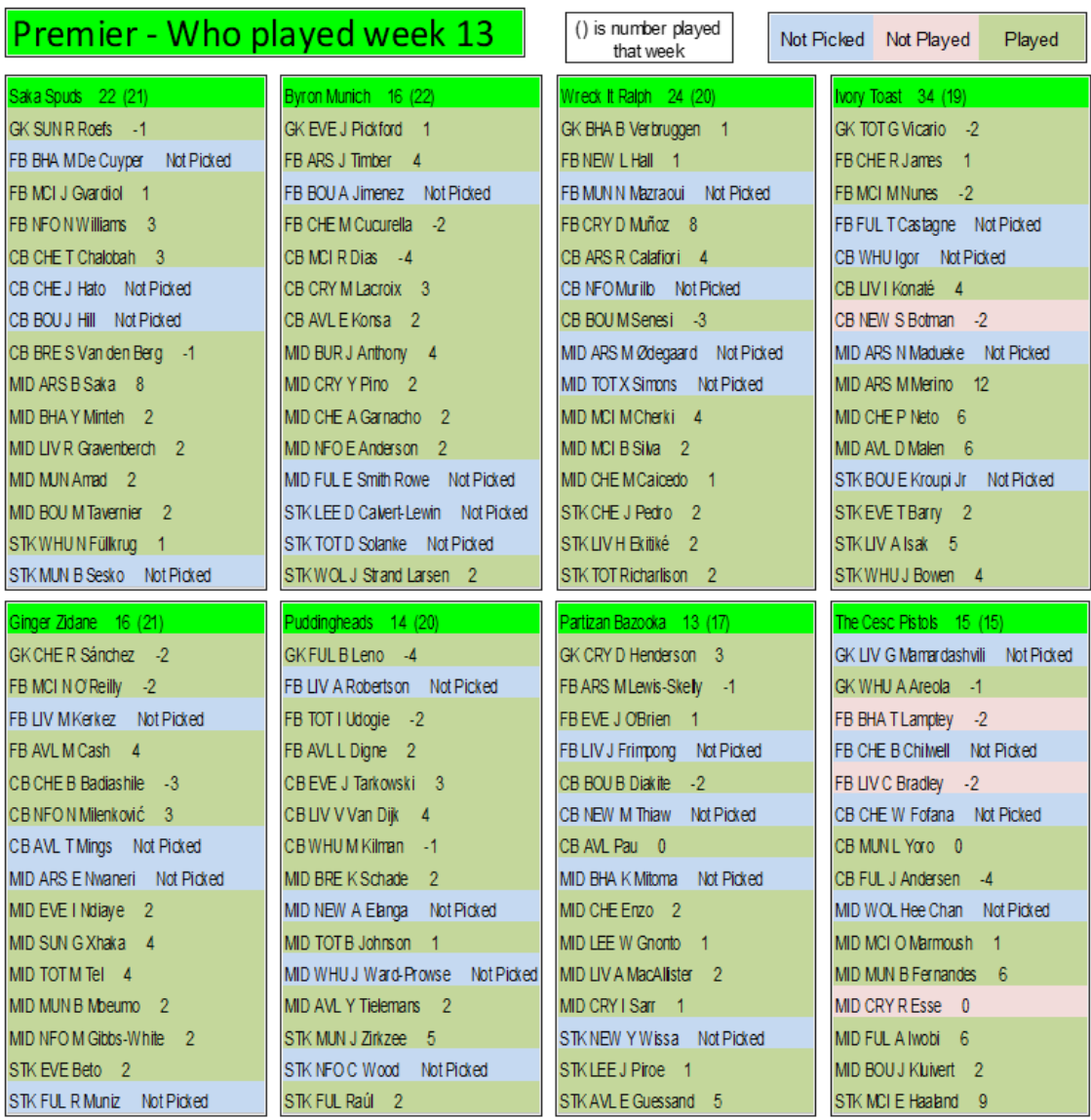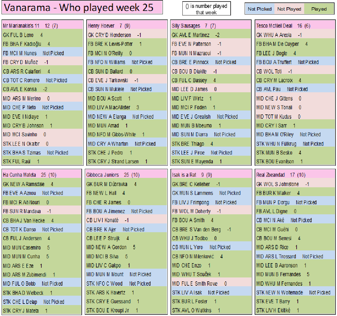 Final week on the final week (If scores are even then it goes on goals, assists, clean sheets, played, If still even then the earliest goal, earliest assist. If still even the player with the most points in the league, if even then the highest score the week before & so on till we have a winner)
