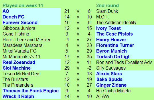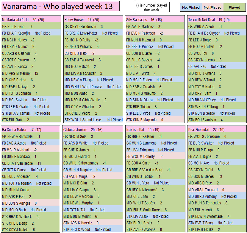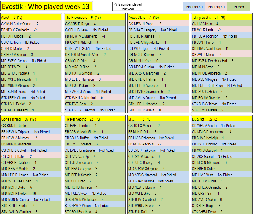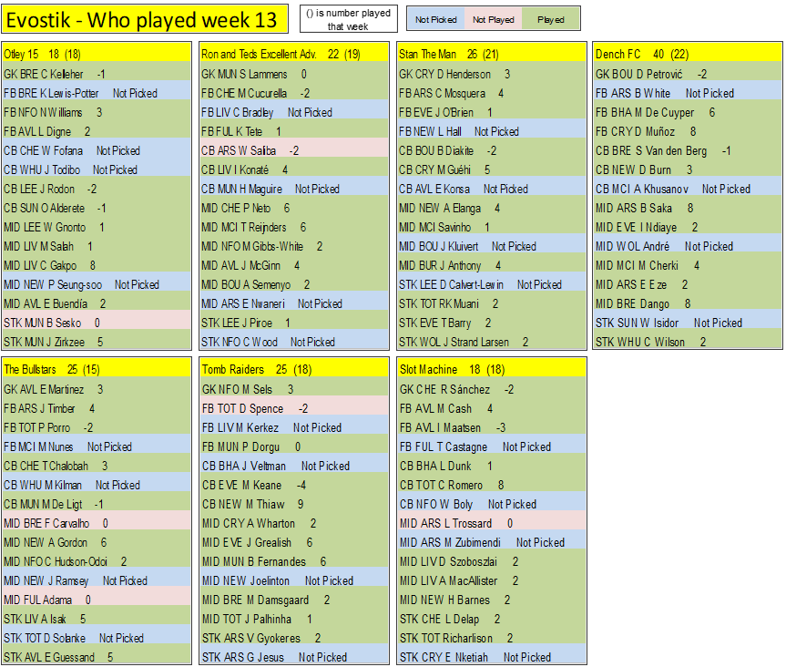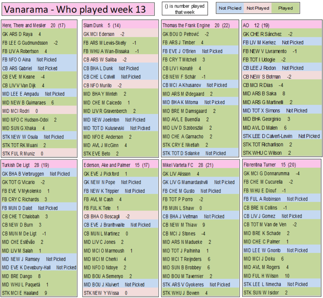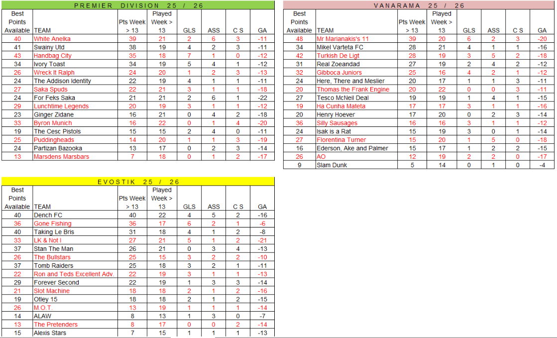 Final week on the final week (If scores are even then it goes on goals, assists, clean sheets, played, If still even then the earliest goal, earliest assist. If still even the player with the most points in the league, if even then the highest score the week before & so on till we have a winner)