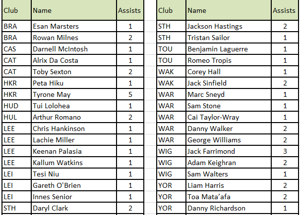 Assists - Half backs & Backs 4 points & Forwards 7 points Goals - 1 point Drop goals - 5 points
